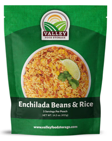 Valley Food Storage Enchilada Beans and Rice features authentic Hispanic flavors in the comfort of your own home making it perfect for a quick and convenient lunch or dinner for the whole family. Each pouch of enchilada beans and rice contain 5 servings.