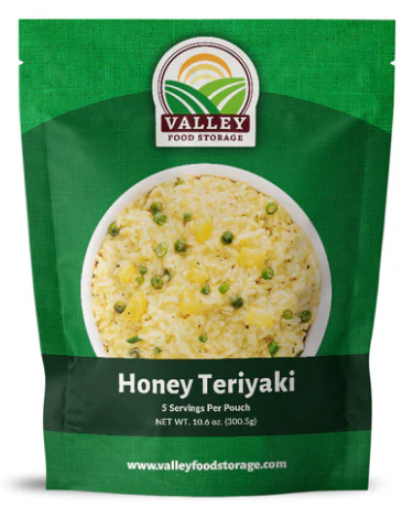 Valley Food Storage Honey Teriyaki features a sweet, tangy flavor and can be used as a side dish with a freeze dried chicken or as a dish all on its own making it perfect for a quick and convenient lunch or dinner for the whole family. Each pouch of honey teriyaki contains 5 servings.
