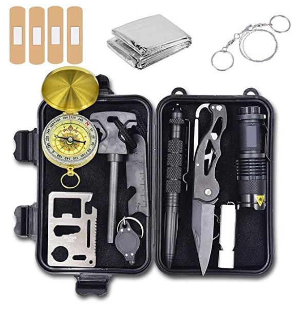 Outdoor survival kit for camping, hiking, climbing, adventures, survival and emergency situations, natural disaster preparation for earthquake, hurricane, snow storm,etc. Or putting in car or truck just in case of emergency or natural disaters