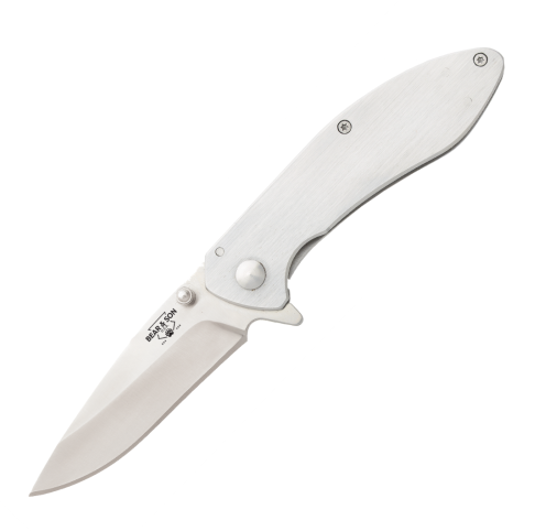 The Bear & Son 112 is an Executive Liner Lock that is constructed from 100% stainless steel. 112 features a 2-7/8″ Hollow Ground Blade that is made from High Carbon Stainless Steel, making this knife rust resistant, easy to sharpen, and holds an exceptional edge. The 112 weighs 2.4 ounce and features dual thumb studs for an easier opening and a frame lock to ensure that the blade remains firmly in place. A Bear & Son engraved pocket clip is added to its design that allows for a tip-up carry. This model is designed to be thin and lightweight for an everyday carry knife. The Bear & Son 112 has an overall length of 7".