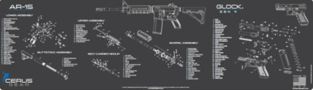 Two of the most widely used firearm models, the AR-15 and Glock are both featured on this extra large cleaning ProMat. Clear and accurate images of each every component in both guns. Get the best of both worlds with this combo mat.