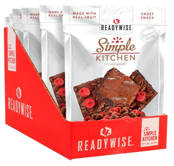 This box includes six pouches of Simple Kitchen's (a ReadyWise Company brand) Raspberries & Brownie Bites. Product Specifications 25g Serving Size 2 Servings Per Pouch 110 Calories Per Serving 2 oz Net Weight Per Pouch 3 Year Shelf Life Made in the USA Dropship Item: Ships from Manufacturer. Please allow additional processing time.