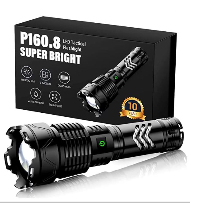 Rechargeable Led Flashlights, 180000 High Lumens Flashlight, XHP160.8 Powerful Tactical Flashlight with Zoomable, 6 Modes, IPX7 Waterproof, Super Bright Flashlight for Camping, Hiking, Emergencies