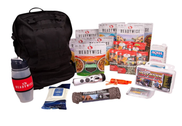 A versatile bag packed with essential emergency items. This tactical backpack is filled with 20 servings of emergency food along with a first aid kit, multipurpose flashlight, water filtration bottle, cooking essentials, and much more (134 total pieces).